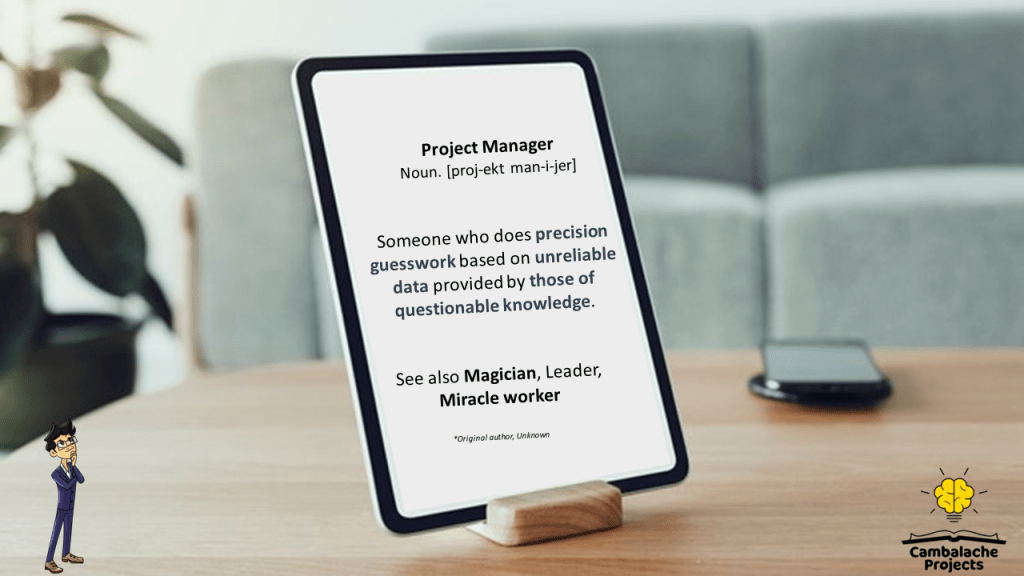 Jajajajaja, es realmente divertido y de alguna manera un tanto cierto porque como Project Managers, trabajamos con suposiciones (datos poco confiables) para desarrollar documentos y cronogramas de proyectos (conjeturas precisas) que ayudan a las personas a crear algo único (para aquellos quienes tienen conocimiento cuestionable).