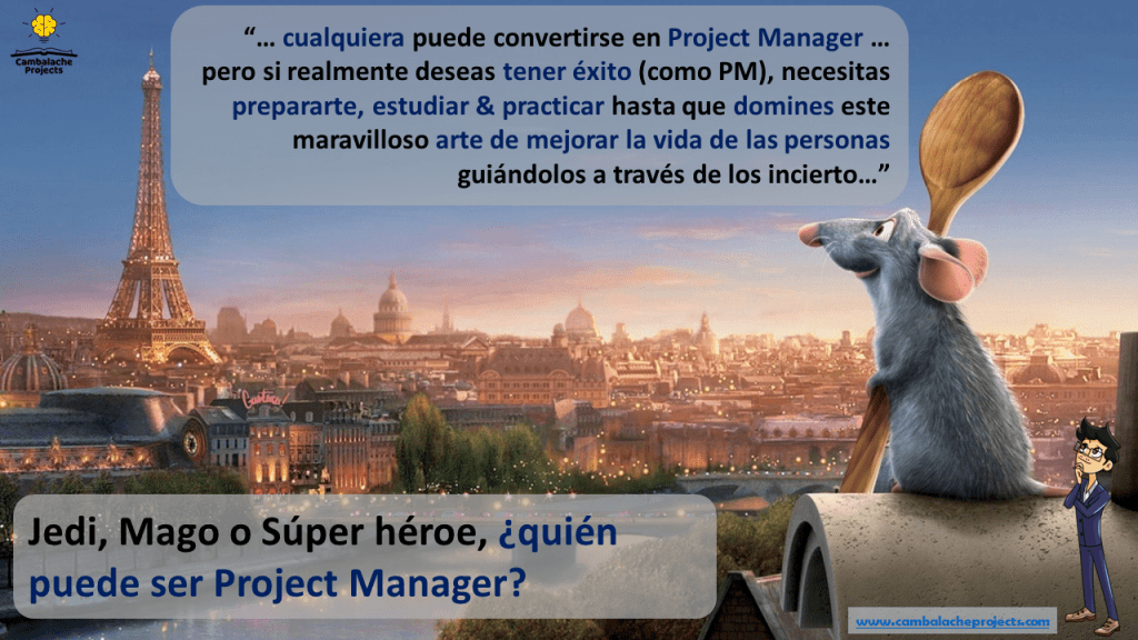 Seguro lo recuerdan y sí, como lo dice esa maravillosa película de Disney, cualquiera puede convertirse en Project Manager (ya lo hacemos de alguna manera; todos somo Project Managers amateur de nuestras vidas); sin embargo, si realmente quieres, si realmente deseas tener éxito como administrador de proyectos, requerirás más que buenas intenciones; necesitaras prepararte, estudiar y practicar más, y hacerlo hasta que domines este maravilloso arte de mejorar la vida de las personas guiándolas a través de lo incierto.